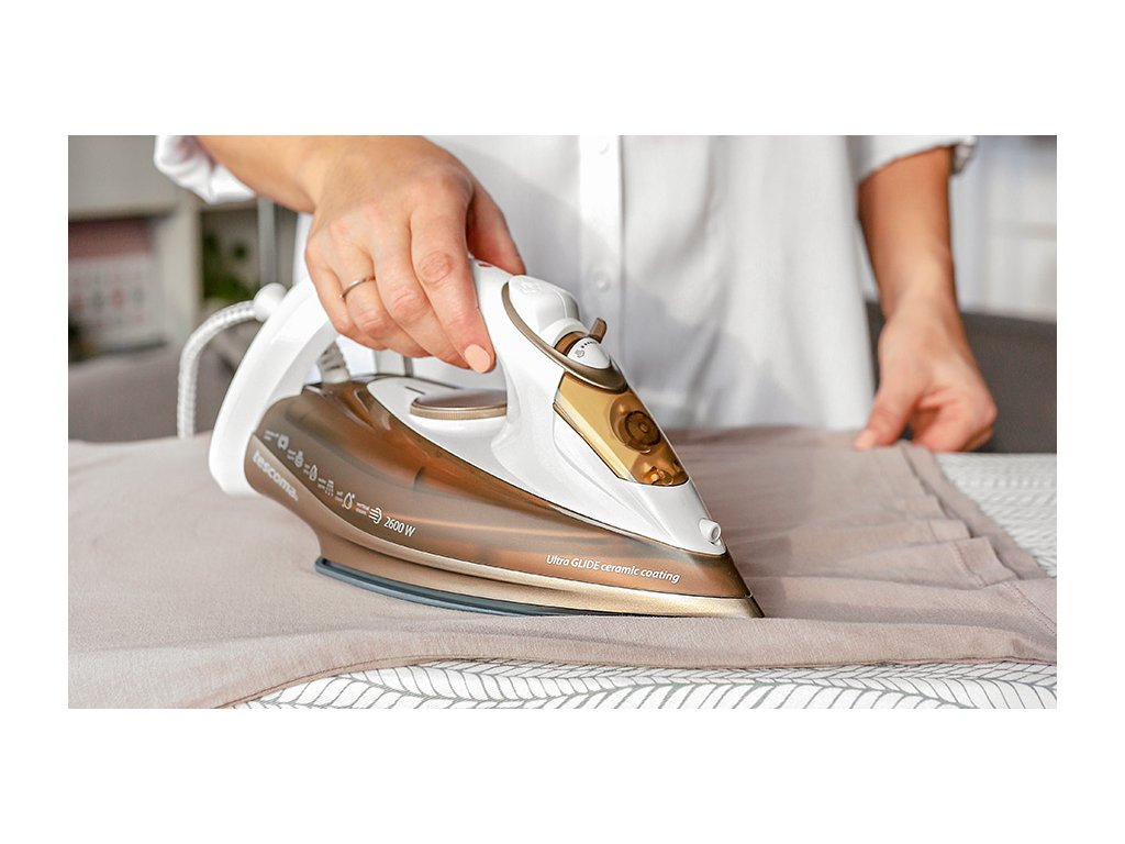 Díky funkci „quick start“ je žehlička připravena už po 30 sekundách. Pokud zůstane nečinná v horizontální poloze déle než 30 sekund nebo odložená ve vertikální poloze déle než 8 minut, ohřev žehlicí desky se automaticky vypne pomocí funkce „auto power off“. Žehlička je také vybavena funkcí ochrany před odkapáváním vody „non drip“ při jejím nedostatečném zahřátí.